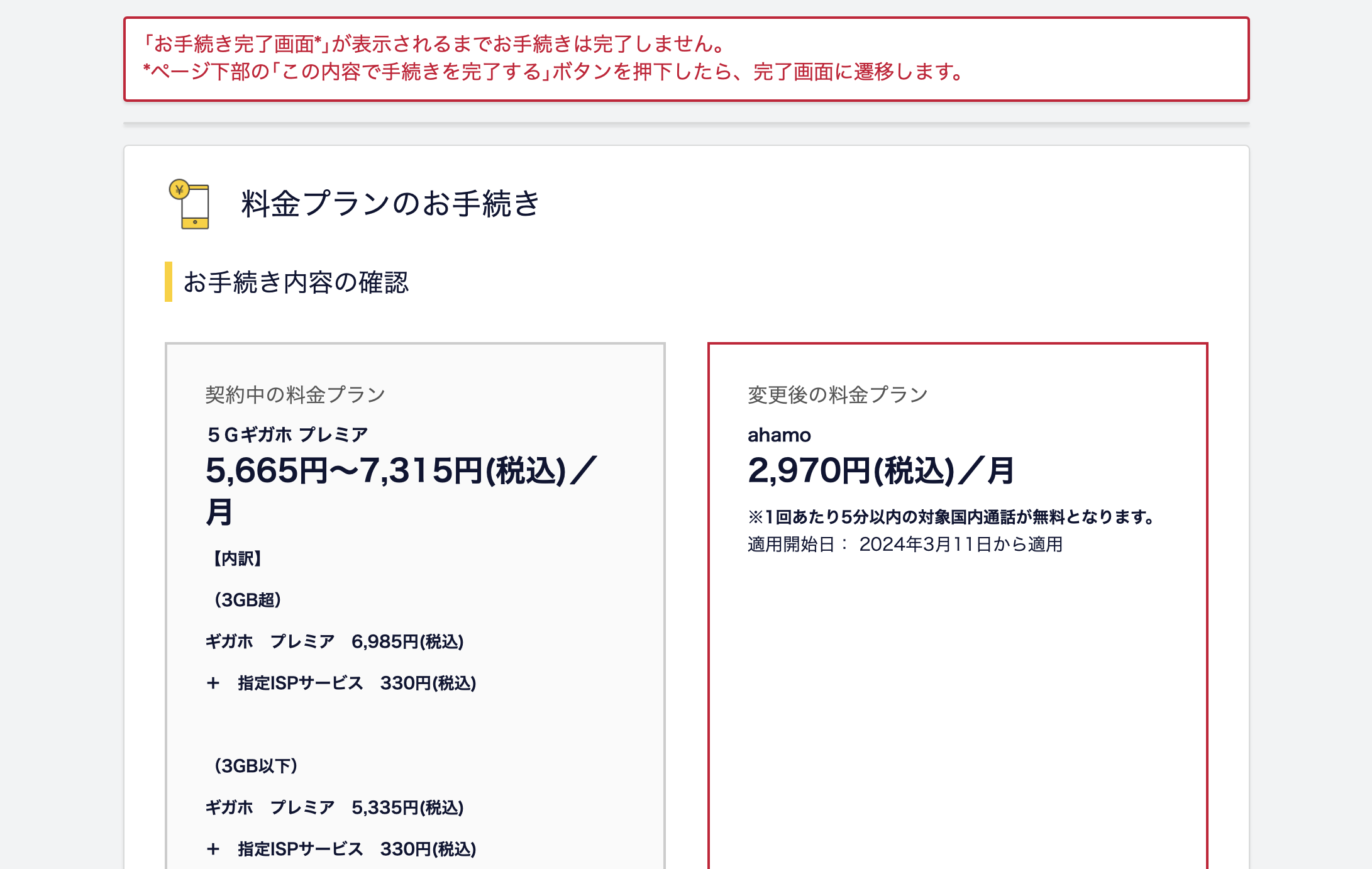 ここもまたちょっとめんどくて、具体的には、請求書を郵送からオンラインに変更しないとahamoの契約ができなかったり、なんか途中でeximoに飛ばされて、ahamoが選べなかったり(マイドコモ体とデフォルトahamoに行けない)したんですが、一回やっちゃえばあとはスムーズでした。