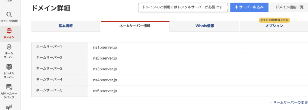 契約しているドメインの管理画面に入り、ネームサーバの向き先をXサーバにします。