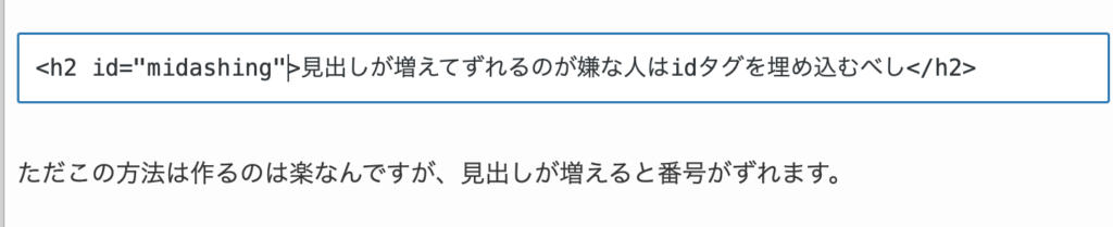 これをやっておくと「#idタグ名」をすればそこに飛べるビーコンになり、見出しが増えてもずれません。