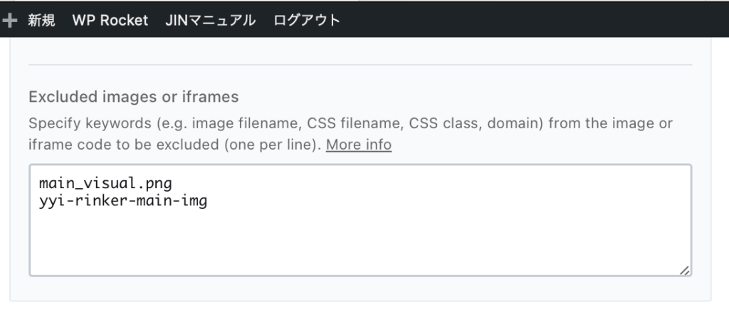 WP-Rocketの設定の中に遅延読み込みの除外エリアがあるので、ここにyyi-rinker-main-imgを追加。