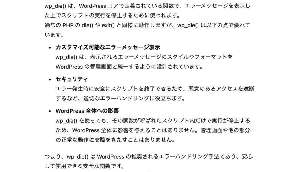 で、そのあとのwp_dieってやつは名前怖いんだけど、wordpressのエラーメッセージスタイルを出す感じのやつで、推奨される方法らしい。