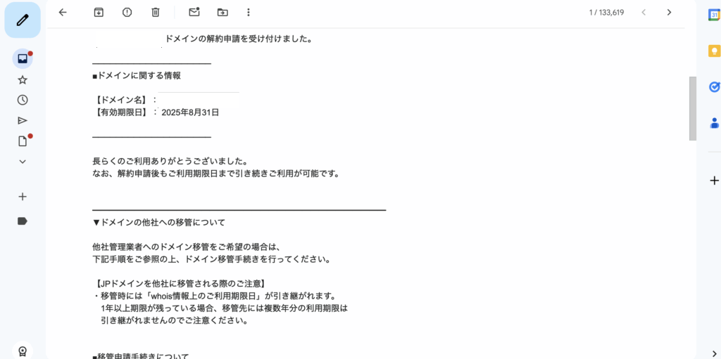 取得したもののうまく使いこなせなかったドメインがあって、1年の更新期限で満了にしたいなと思っていました。